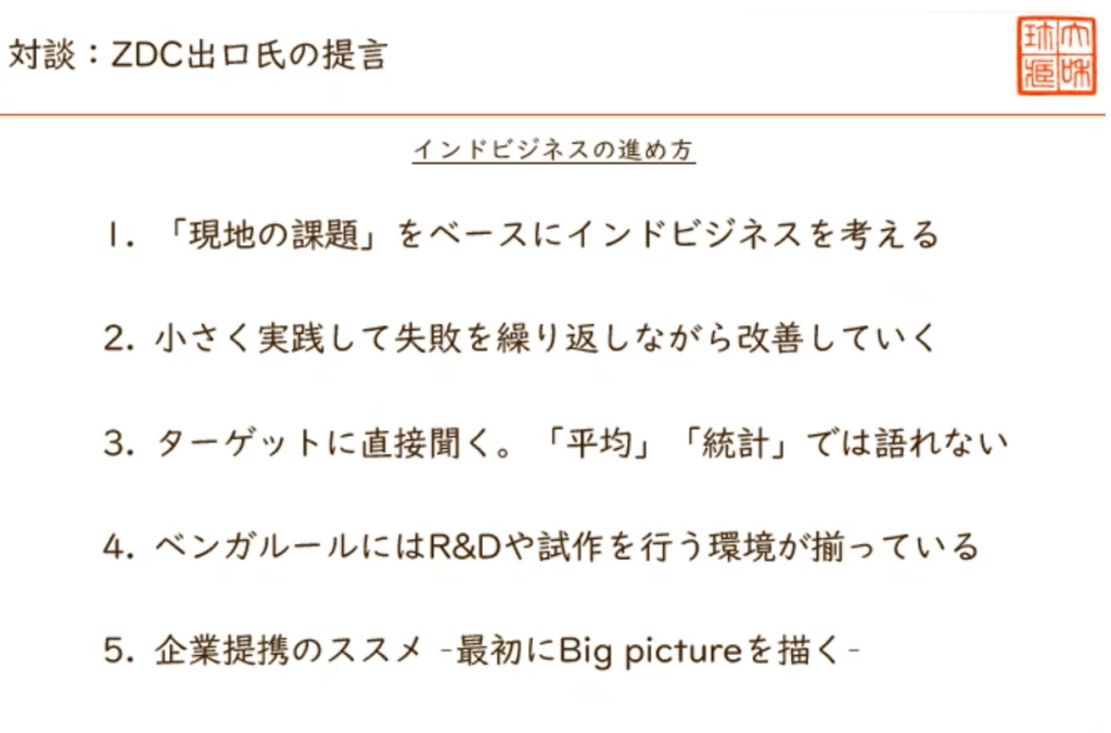 対談の中で出口さんはインドビジネスの進め方として以下の5つを提言しました。