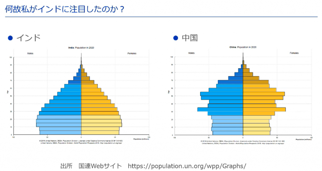 インドに注目し活動を続けている点について、出口さんはインドと中国を比較した人口ピラミッドを提示し、