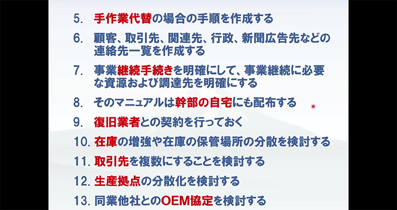 続いてBCPにおける重要事項・要点として、稲葉さんは以下の13の項目を挙げました。