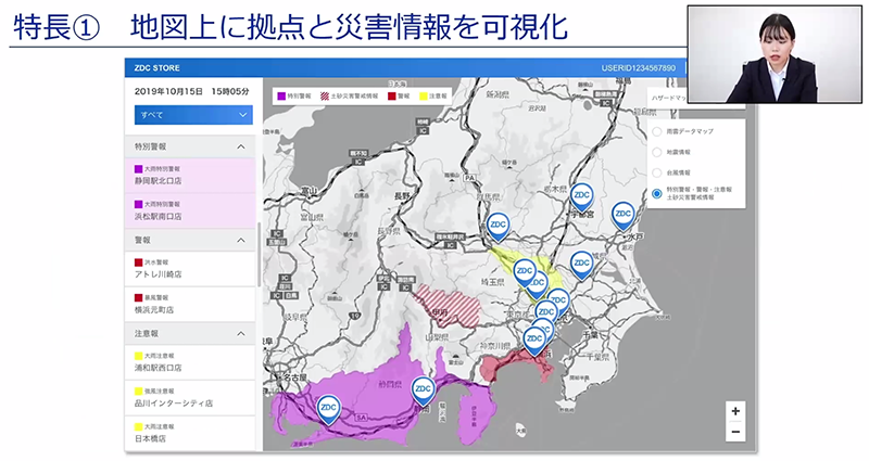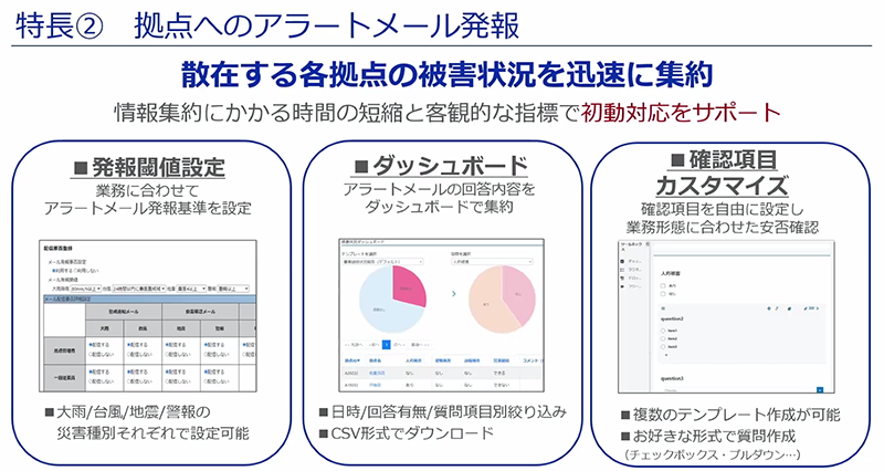 「Area Marker」の特徴として、笹川さんは「地図上の拠点と災害情報を一度に可視化できること」「拠点へのアラートメール発報」の2つを挙げました。