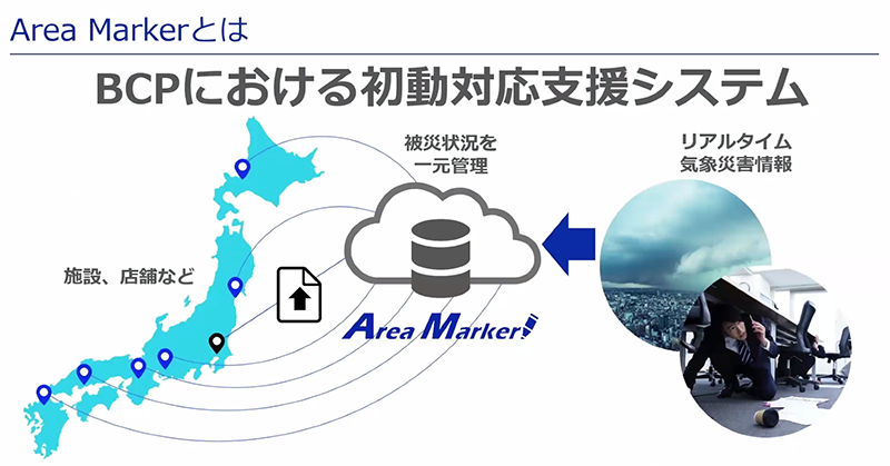 続いて当社のBCPにおける初動対応支援システム「Area Marker」の概要と特徴を紹介しました。