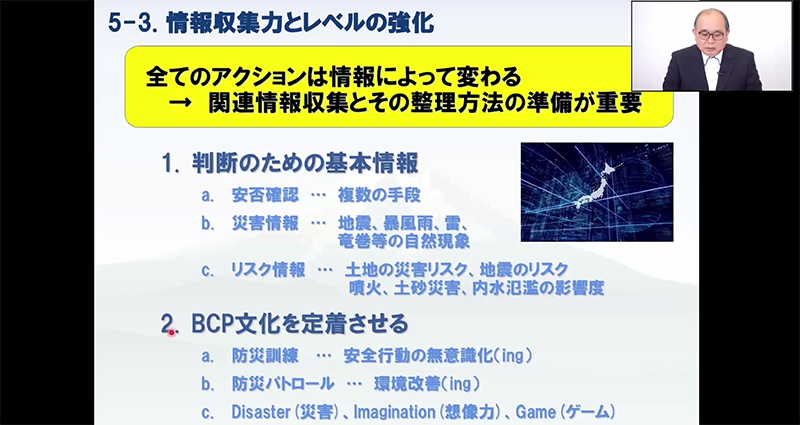 また有事の際の社員の安否や災害の発生場所、リスク情報等をDX化によって効率的に収集すること、BCPを定着させるために日ごろから防災訓練やパトロール等を実施することが有効であると説明し、講演は終了しました。