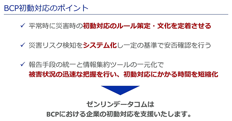 最後にBCPにおける初動対応のポイントとして「ルールを策定し、文化を定着させること」「リスク検知をシステム化し、一定の基準で安否確認を行うこと」「被害状況を迅速に把握し、初動対応にかかる時間を短縮すること」の3つについて振り返りを行いました。