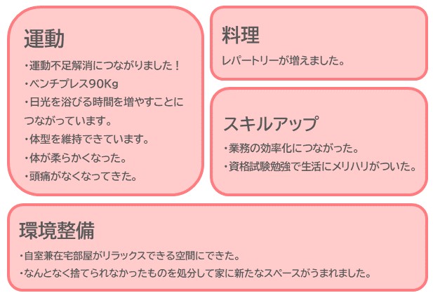 料理や資格取得といったスキルアップ、またテレワーク環境の整備といった3つのカテゴリーが同一2位となりました。