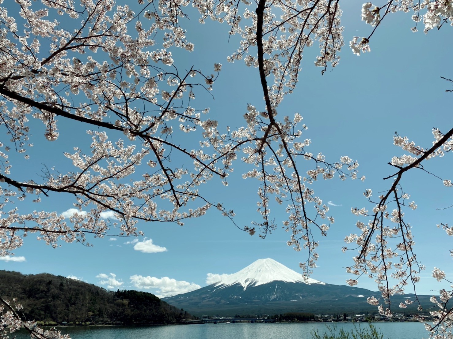 河口湖に行った時の写真です。富士山と桜が一緒に見られて、最高の景色でした。湖畔沿いに美味しいパン屋さんがあるので、おすすめです!