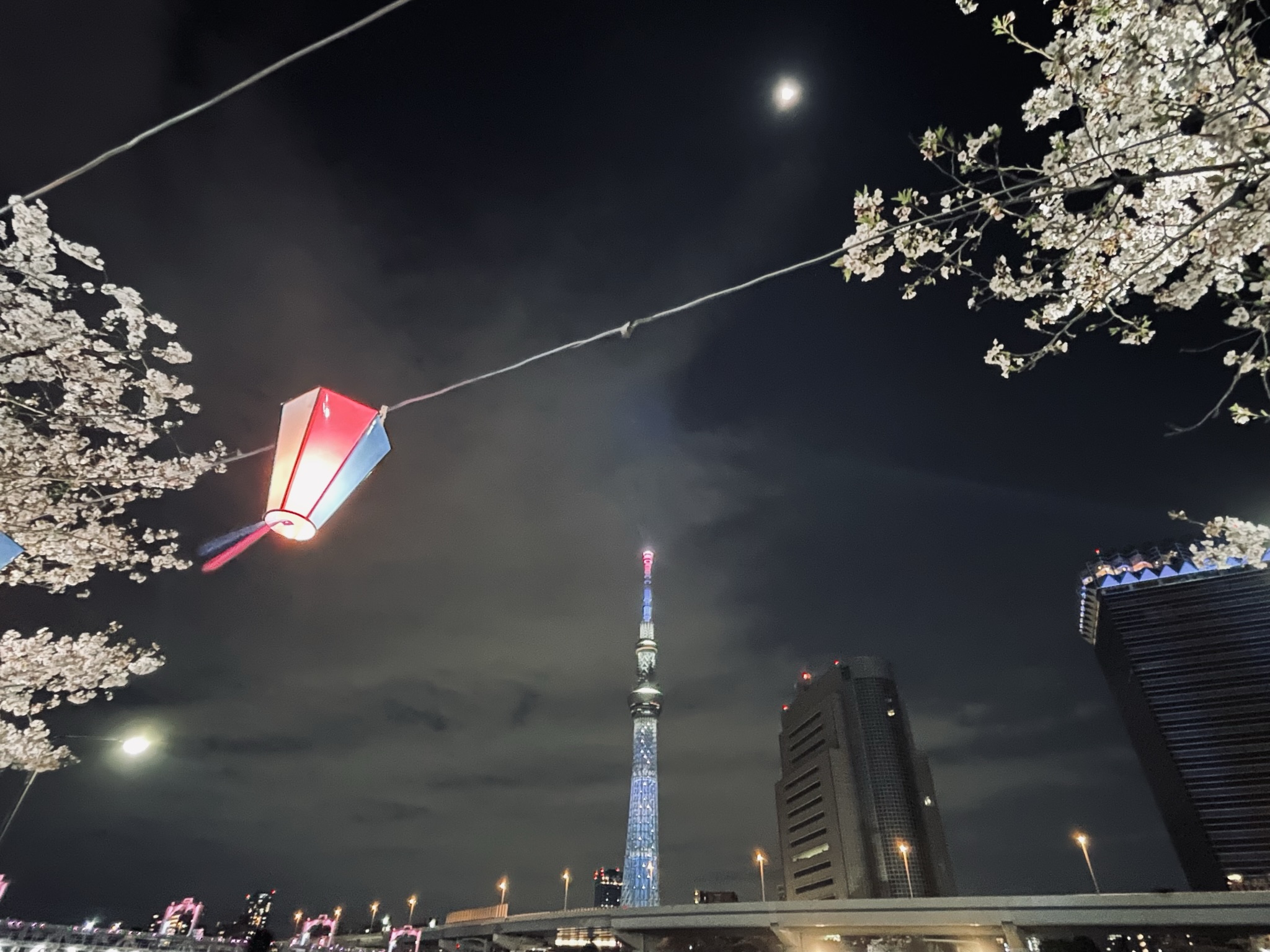 隅田公園(浅草側)から、スカイツリーと桜と月が一緒に見られました。