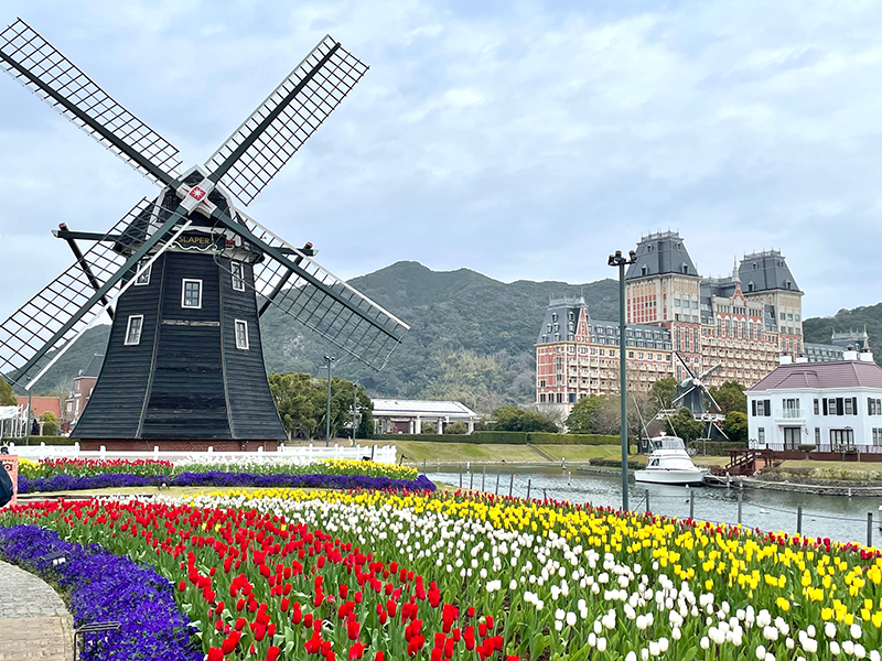 長崎県・ハウステンボスでの1枚です。3月中旬に旅行で行きましたが、ちょうどチューリップが綺麗に咲いていました!5月上旬からはバラが見頃のようです。