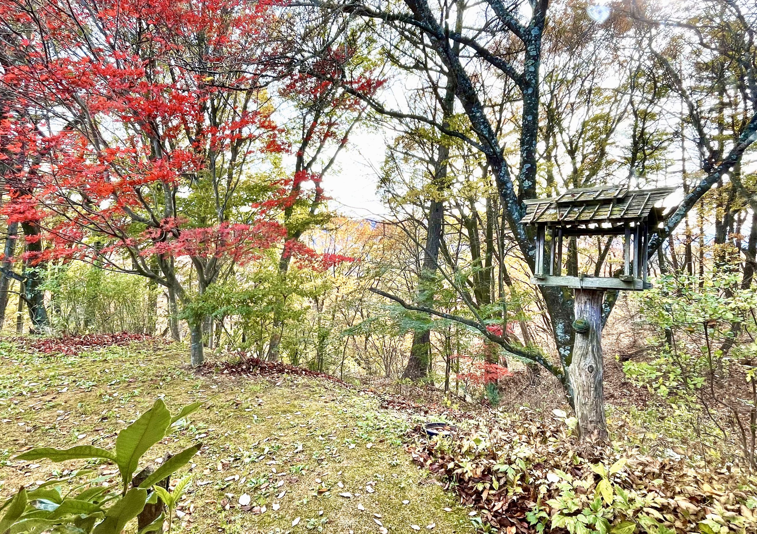 木に囲まれた小さな餌台が、周囲の自然との調和を一層引き立てています。