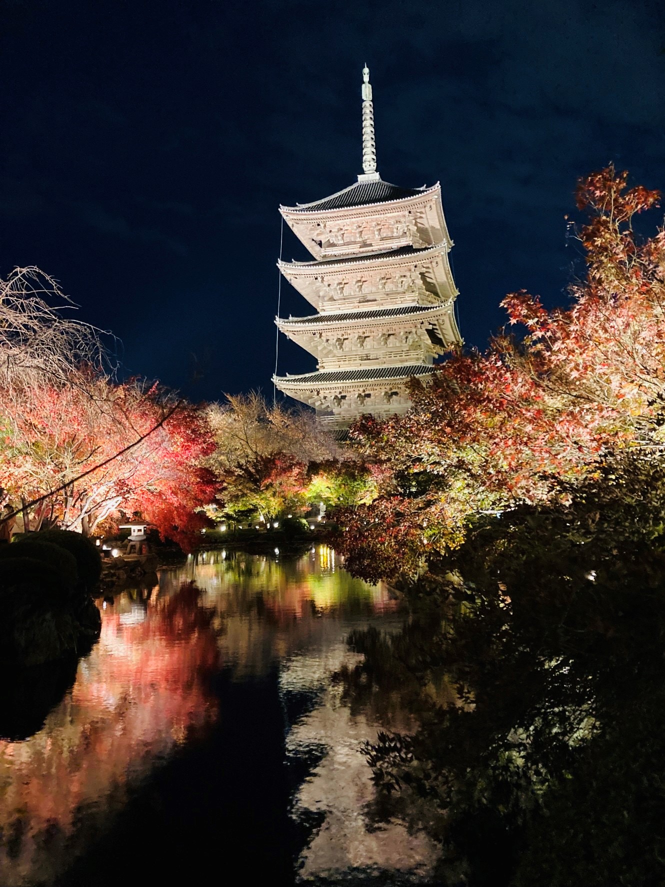 東寺の写真です。ライトアップされた五重塔と紅葉が素敵で、夜の寒さも忘れて見入ってしまうほどでした。