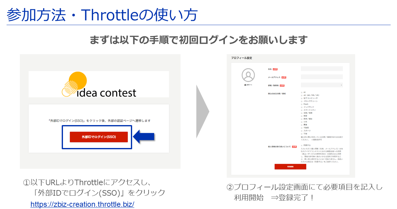 Throttleにアクセスし「外部IDでログイン(SSO)」をクリック、プロフィール設定後にご利用いただけます。
