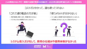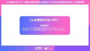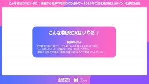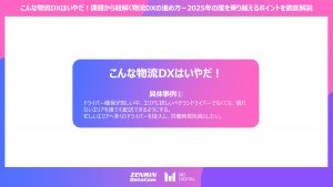 今回のセミナーでは、失敗事例を全面的にアピールするのはあまりよくないさないのでは?いう意見もいただいたため、「こんな物流DXはいやだ」とキャッチ―なタイトルとしました。