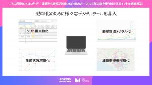 本ウェビナーには小濱さんのほかに、エムシーデジタル株式会社のモビリティ部門 部門長の平山 遊喜さん(以下 平山さん)とモデレーターとしてエムシーデジタル株式会社の佐伯 慎太郎さん (以下 佐伯さん)の2名も登壇し、物流DXに関する失敗事例を挙げながら2025年の崖問題を乗り越えるためのポイントを紹介いたしました。
