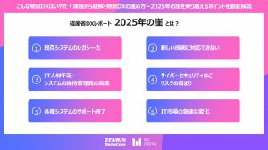 はじめに、DXプロセスと経産省がDXレポートにて発表したDXの足枷となっている2025年の崖問題とは何かについて解説いたしました。