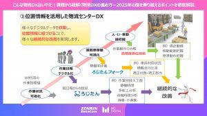 次に物流DXについてのターゲットやソリューションについて当社で行っている物流DXの3つのソリューション支援を具体例にあげて小濱さんから紹介いたしました。