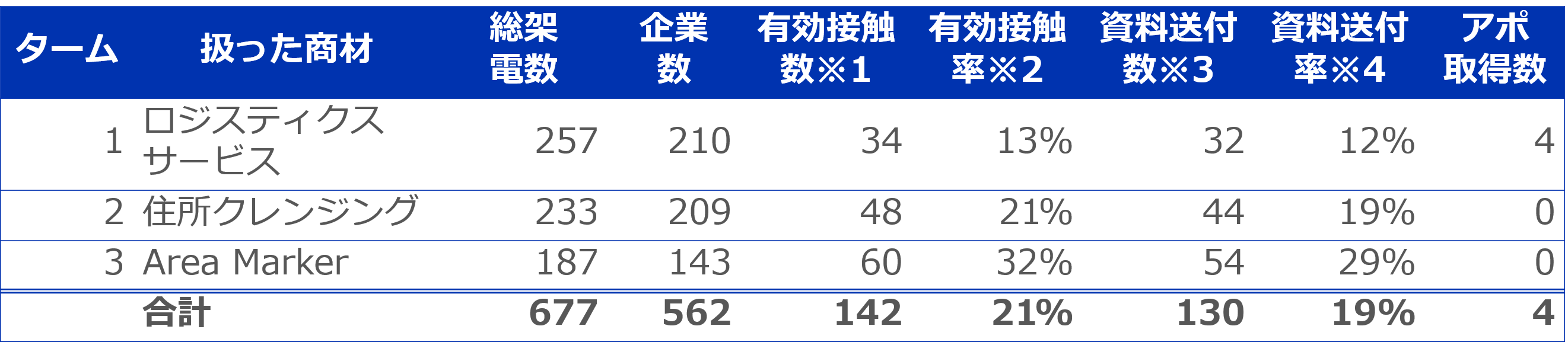 全体を通しての有効接触数は194件、資料送付数は96件に及び、4件のアポイントメントの獲得に成功しました。