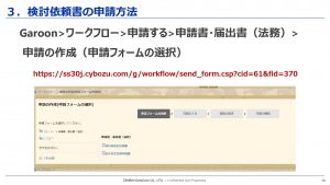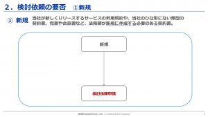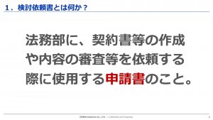 法務部が一から作成する必要がある契約書は、すべて検討依頼書の作成をお願いしております。