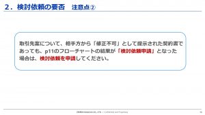 法務部で内容を確認して、当社に不利な内容が書いていないか不当な義務を課されていないか、当事者間できめた取引内容と相違がないかということを法的な視点で確認していく必要がございます。