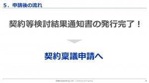 契約審査がおわりましたら、契約稟議の申請にうつっていただき最終的に契約を締結するという流れになります。