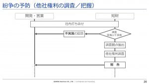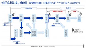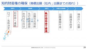 ロゴや名称が決まったら、知的財産部へ連絡を行い、知的財産部のほうで先行商標調査を行う。出願可能だった場合は、執行役員会で審議となる。 特許権との社内の流れの違いは、出願できる場合は執行役員会で審議する必要がある。