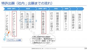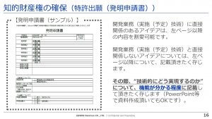 アイデアが直接特許出願に結びつかなくても、発想そのものが打ち合わせをすることで広がることもあると思うので、まずはアイデアが思いついたら気軽にアイデアシートに記入していただきたい。 知的財産部としては、出していただいたアイデアをなるべく特許出願にもっていけるように内容を細かく確認させていただいたり、別観点からお話をさせていただいたりすることもあると思うので、ご協力いただきたい。
