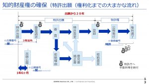 特許庁に申請すると1年6か月後に自動的に出願公開され、付される番号も「特願」から開示の「特開」に変更となる。特許は出願しただけでは権利化されないため、出願から3年以内に出願審査請求をしなければならない。出願審査請求書が提出されてはじめて特許庁で審査が始まります。審査の結果、出願した発明の内容と似ている内容があれば、それをベースに拒絶理由書が提出される。特許査定がでたあとに特許料を支払うことではじめて特許権を取得することができる。4年目以降は、毎年手数料を支払わないと権利が失効してしまう。