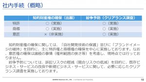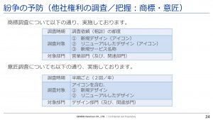 特許と商標に関しては、出願とクリアランス調査の両方を実施しており、意匠に関しては、出願は実施しておらずクリアランス調査のみ実施している。諸般の事情については、2014年頃に画像意匠が保護されるようになり対応はしてきたが、実際に意匠権を活用できる権利範囲が狭く、費用対効果も踏まえ現時点では積極的には行っていない。