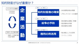 知的財産権の確保・紛争の予防・権利の利活用の3つで企業活動を下支えしている。
