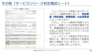 知財調査が必須事項になっているので、ニュースリリース発信予定がある場合は早めに知的財産部へ調査依頼の連絡をお願いします。