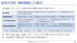 自社製品が他社の特許侵害をし、訴訟に敗訴した場合表のようなリスクを負うことになります。