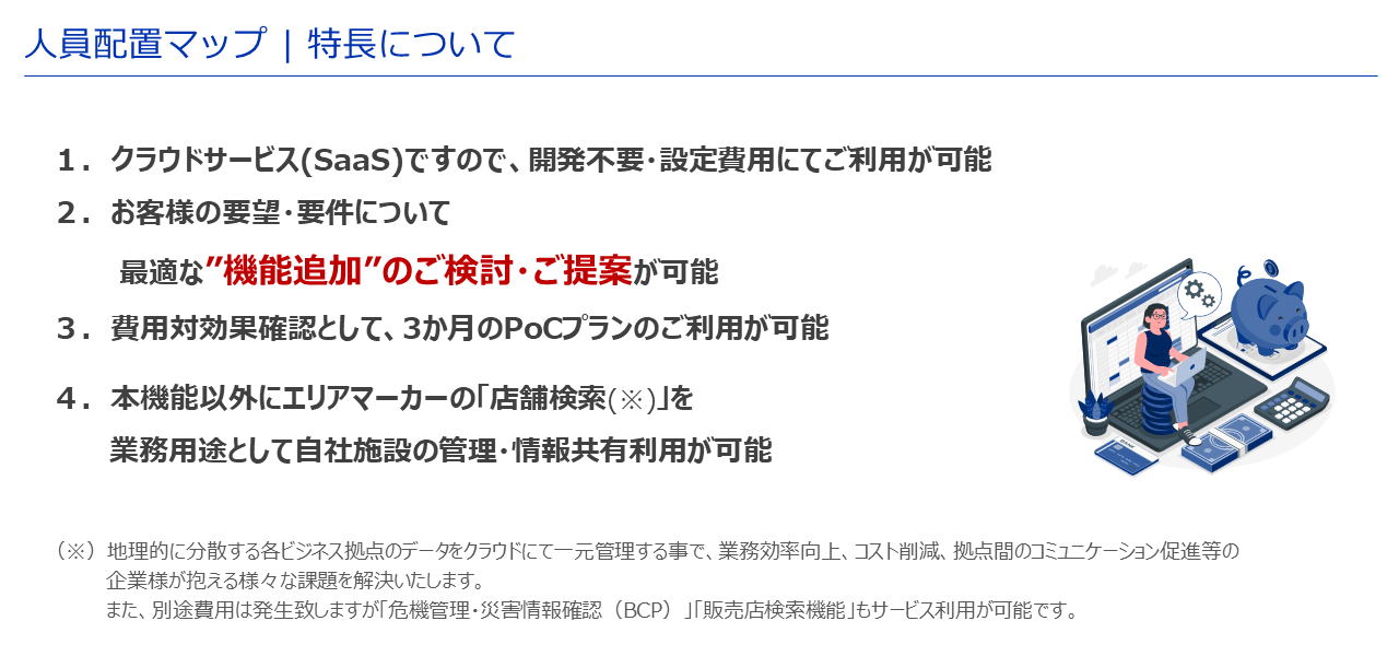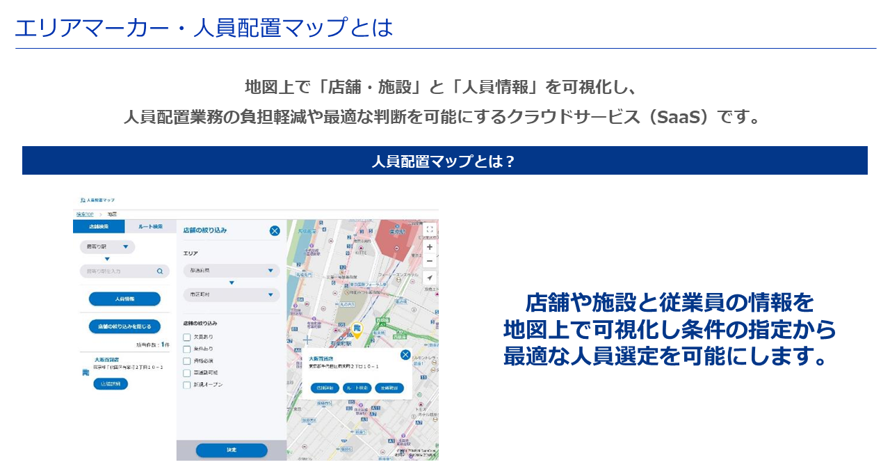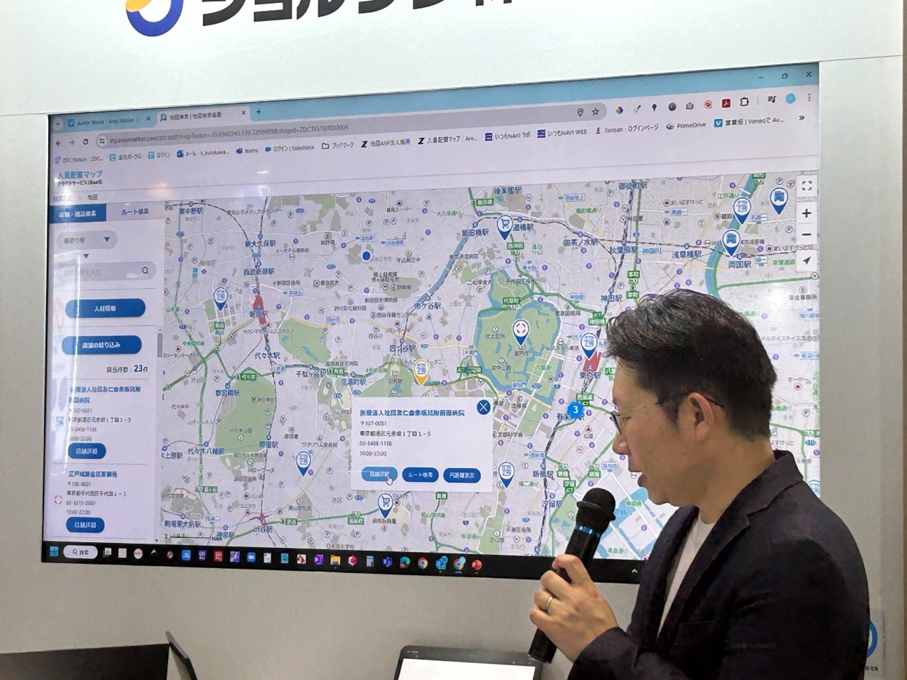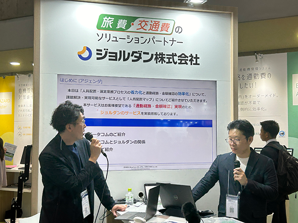 2024年5月8日(水)15:00〜15:30、東京ビッグサイトで開催された「総務・人事・経理Week春」内のジョルダン株式会社(以下 ジョルダン社)のブースで行われたクロストークに、パートナー第二事業部の黒川 健一さん(以下 黒川さん)が登壇し、地図上で「店舗・施設」と「従業員等の人員情報」を可視化し、指定した条件から最適な人員選定を可能にするクラウドサービス「人員配置マップ」を紹介しました。