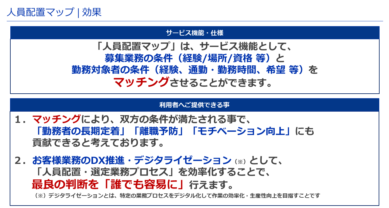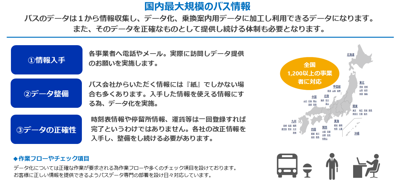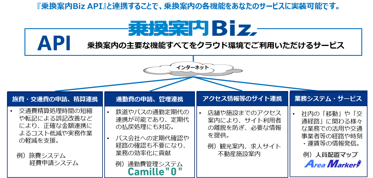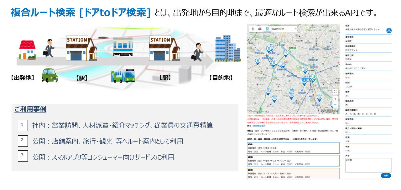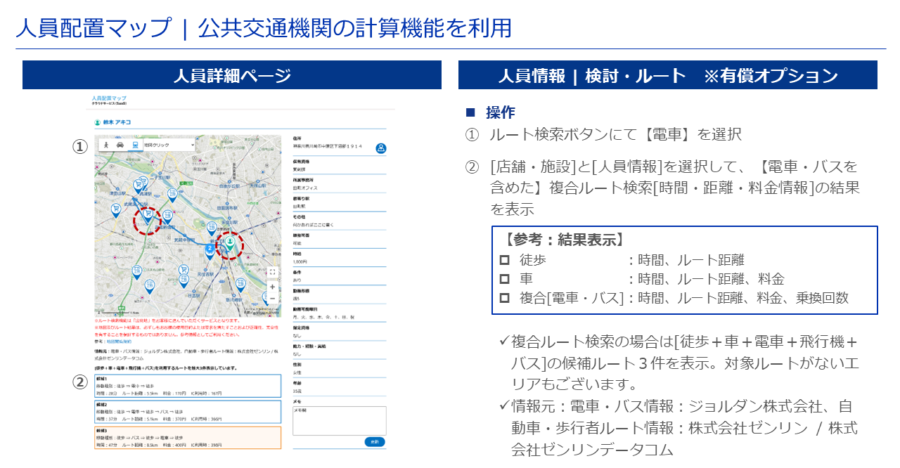 「人員配置マップ」では、通勤経路と金額の確認を実現するために、ジョルダン社保有の「乗換案内Biz API」と「全国バス停データ」を活用した「いつもNAVI API・複合ルート検索[ドアtoドア検索]」機能を搭載しています。