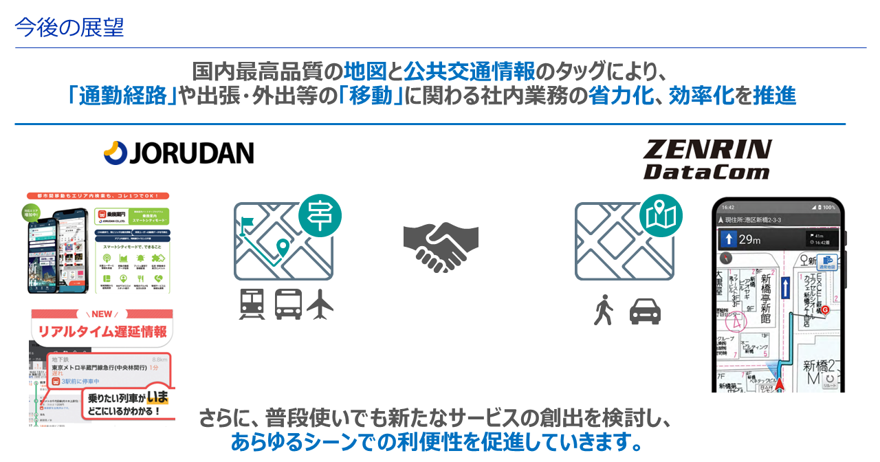 最後に小川さんから「ゼンリンデータコムの国内最高品質の地図とジョルダンの公共交通情報という強みを組み合わせて、通勤経路や出張・外出等の『移動』に関わる社内業務の省力化、効率化など、今後もあらゆるシーンでの利便性を促進していきたい」、黒川さんから「乗換案内と地図というのは非常に親和性があり、どちらも利用したいというお客様からのニーズもあるため、今後も相互で協力してサービス提供ができれば」と今後の展望について述べられ、クロストークは終了しました。
