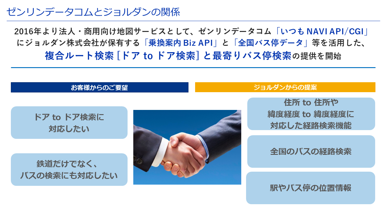 ジョルダン様には、当社の「地図データ・地図API」を「法人・個人向けサービス」にご利用いただいており、パートナー会社として長年にわたって協力関係を築いておりますので、今回のクロストーク参加により、さらなる連携の強化につながると考えております。
