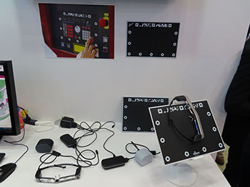 スマートグラスを通して黒いパネルを見ると、肉眼では見えない操作パネルが出現します。その操作パネルのボタンなどを押すと、連動している工場設備などを動かすことができ、スマート工場化されるという内容でした。