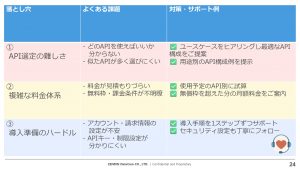 利用目的によって適切なAPIが異なるため、要件を明確にした上での選定が重要です。目的とAPIを正しくマッチングさせるには、ある程度の知識や経験が必要となるため、初めて導入される企業にとってはAPIの選定自体がハードルとなってしまうことがあります。