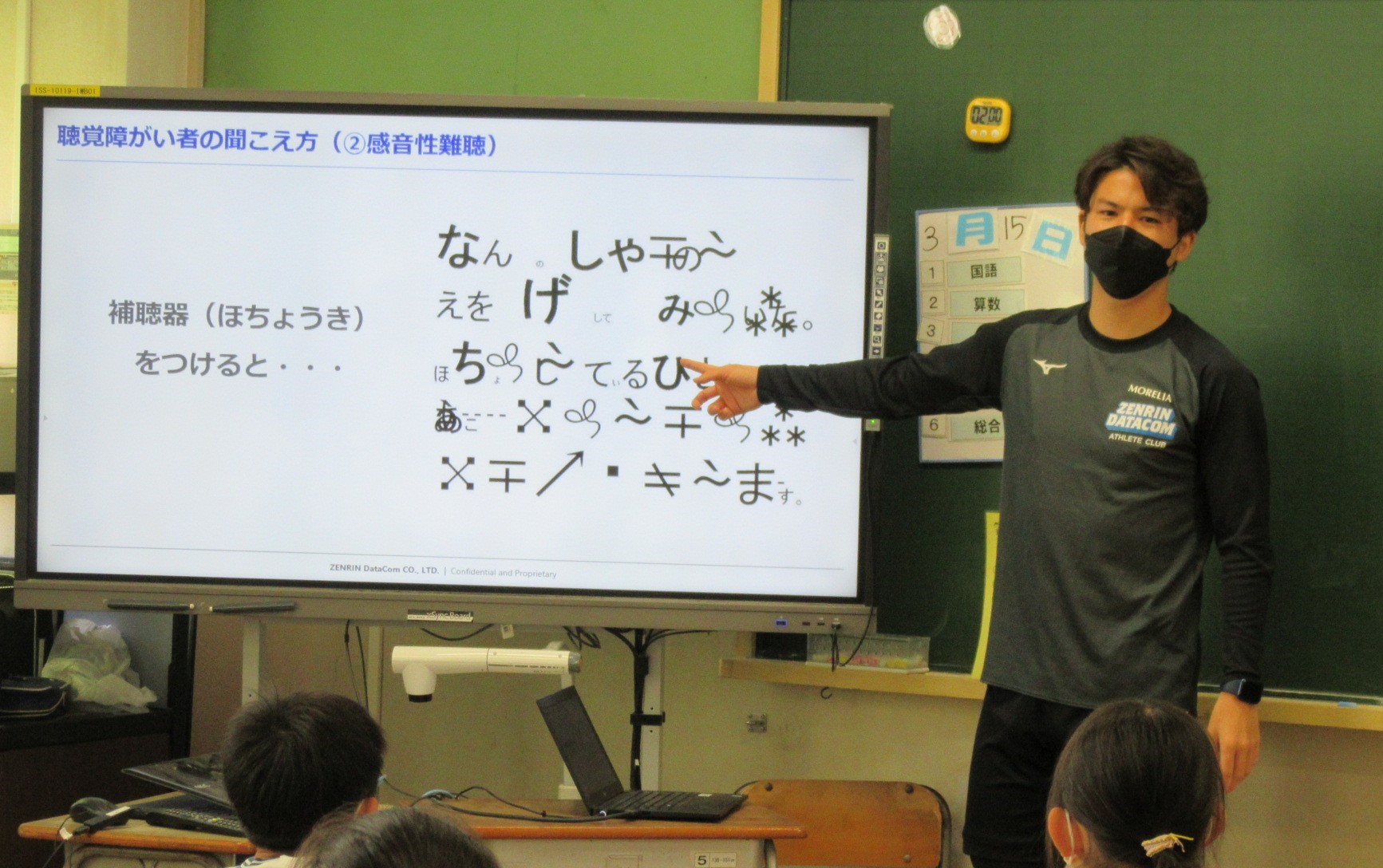 『障がい理解推進活動』として、子供たちに「聴覚障がい」とは何か、もし「聴覚障がい者」と会ったらどんな行動を取ればよいのかを一緒に考えながら授業を進めました。