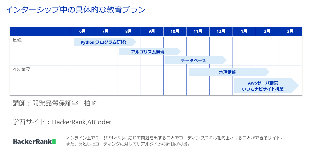 インターンシップ中の教育内容としては、コミュニケーション技術については体育会の出身者が多いSEアシスト社が、プログラミング等の開発技術については柏崎さんが教育を行っています。