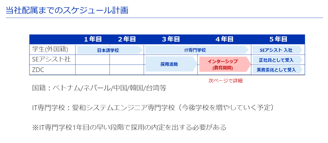 次にインターンシップ期間を設け、当社とSEアシスト社で内定者への教育を行います。