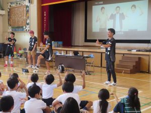 岡田選手を含むデフサッカー日本代表選手4名は、小学3年生から6年生を対象に自己紹介を行い、デフサッカーの特徴や試合中にどのようにコミュニケーションをとっているのかを紹介しました。