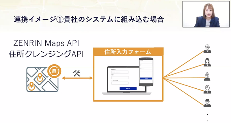 最後に「住所クレンジングAPI」の紹介と、「住所クレンジングAPI」導入時の連携イメージについての解説、質疑応答をし、ウェビナーは終了しました。
