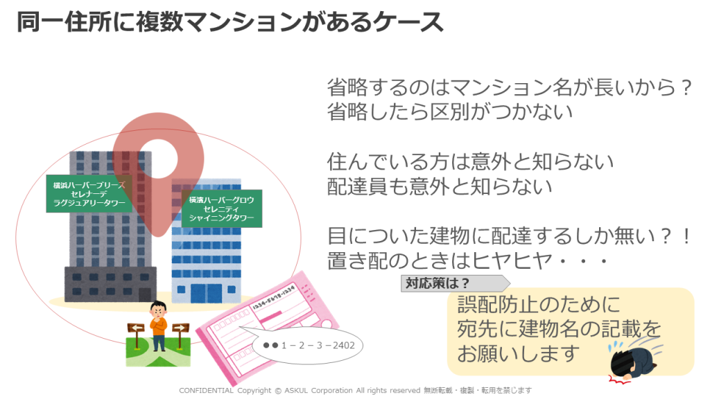 続いて小野さんが「難しい住所への物流の対策術とは?」というテーマで、パネルディスカッションへのつなぎとして、配送現場が直面している住所問題4つと、その対応策の一部を紹介しました。