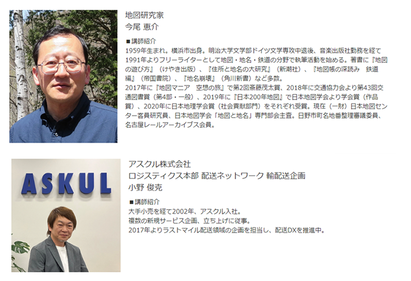 今回のウェビナーには、地図研究家の今尾 恵介さん(以下 今尾さん)、アスクル株式会社 ロジスティクス本部 配送ネットワーク 輸配送企画の小野 俊克さん(以下 小野さん)、株式会社Geolonia 代表取締役CEOの宮内 隆行さん(以下 宮内さん)の3名をゲストにお招きして行われました。