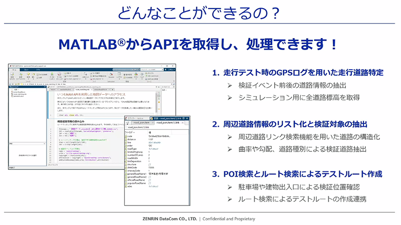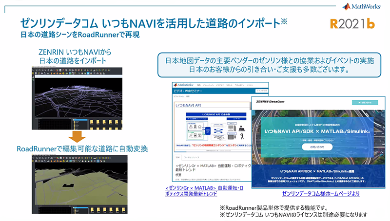 「いつもNAVI API」を活用してできることとして①「RoadRunner」にインポートしたデータへ加工・修正を施すことで、リアルな道路モデルを作成できること②「MATLABⓇ※」からAPIを取得し「いつもNAVI API」の各種機能・情報と連携させることで、効率的に検証が行えることの2点が挙げられました。