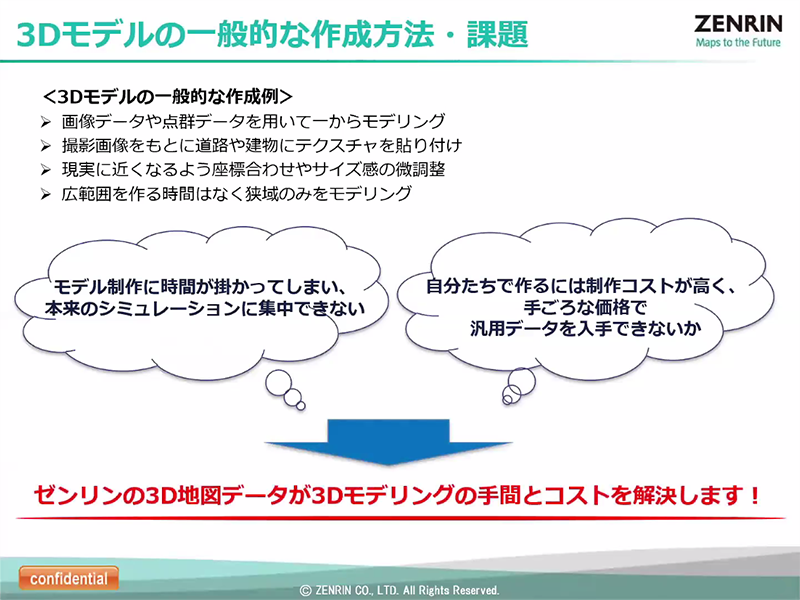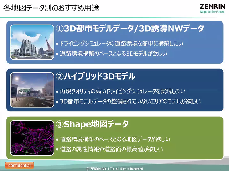 用途に合わせて各種3D地図データを使用することで、道路モデル作成の際にかかる時間や手間、コストといった課題の解決につながることをアピールしました。