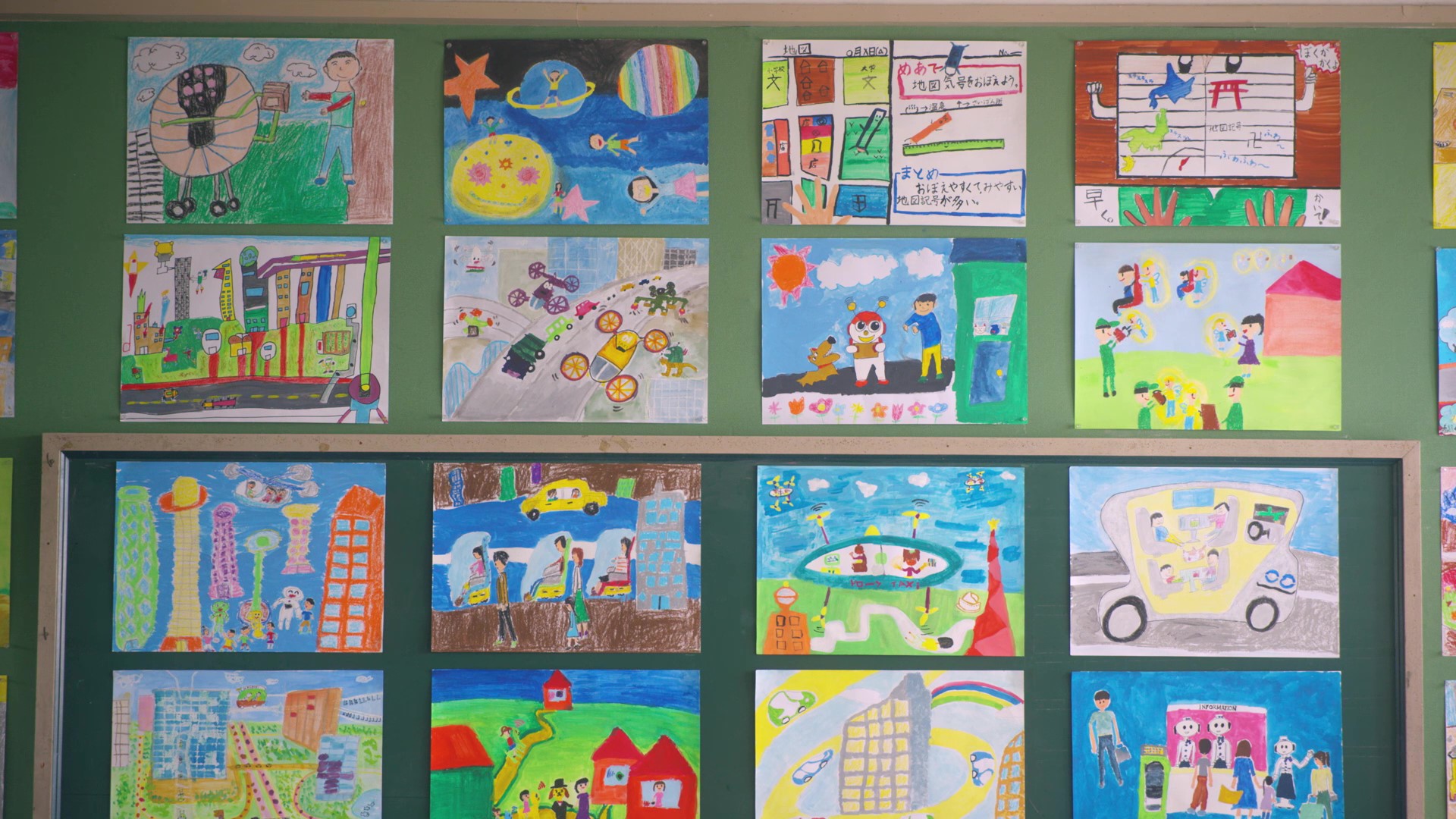 子供たちが未来をテーマにした絵を描いている小学校の教室に