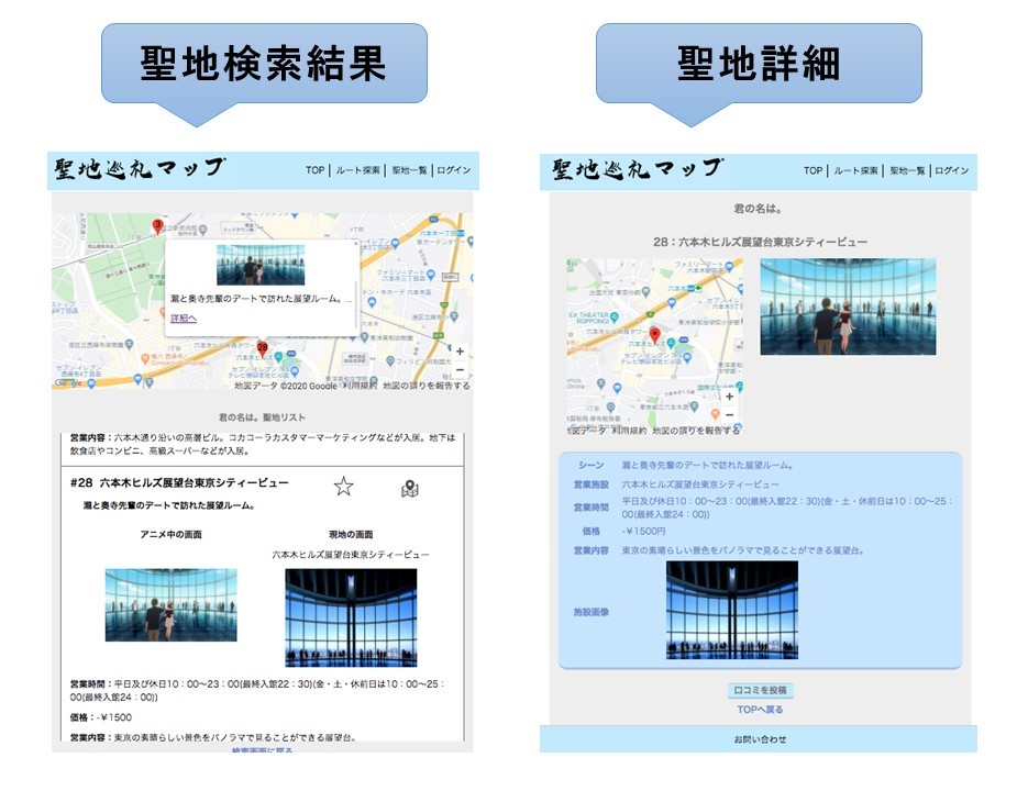 聖地巡礼に着目したアプリ。聖地検索をして聖地の位置を地図上に表示する機能をベースに、既存の聖地巡礼に関するサービスにはないルート生成機能を搭載しました。また口コミ投稿やSNS同期機能なども追加し、ユーザー同士の情報共有も可能に。聖地巡礼を1つのアプリで楽しむことができます。