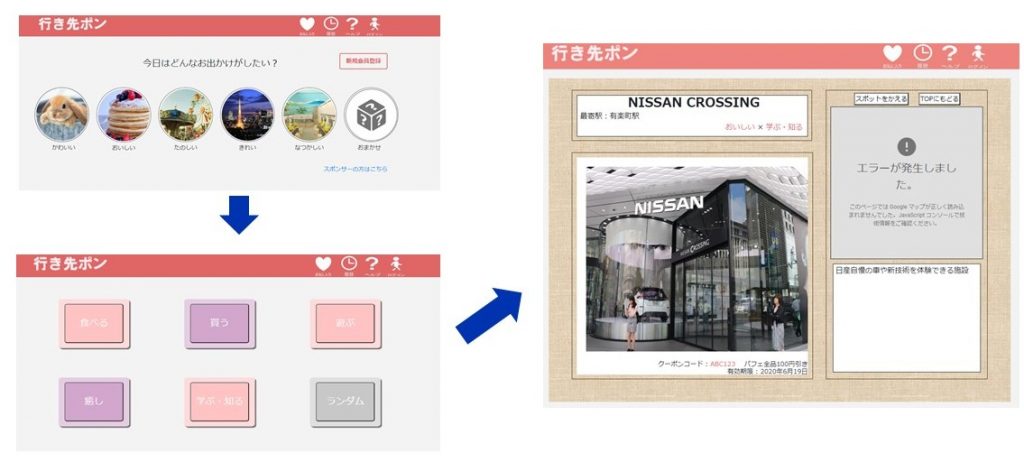感覚で行き先を決めたい人、お出かけ先を決めるのが面倒、行き先のマンネリ化を感じている、また目的がないが出かけたい人に行き先を提案するアプリ。感情から行先を決めるという点で他の既存サービスとの差別化を図りました。感情選択→目的選択の2クリックで行き先がランダム表示されるという簡単操作もポイントです。