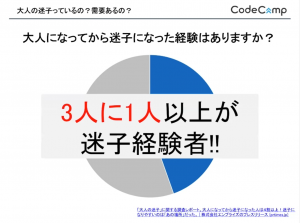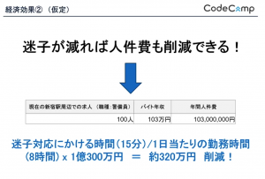 各種データをもとに迷子になる確率や迷子になりやすい場所などを提示し、調査対象である新宿駅での乗降者数データをもとに新宿駅がいかに迷子になりやすいかを説明いたしました。