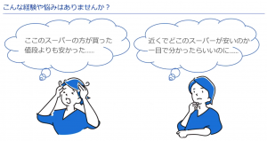 買い物に行く前に選択した範囲の中のマップ上で各スーパーの商品の価格や品質、品ぞろえを容易に比較できるをコンセプトに「Super Superべんりナビ」アプリを作成いたしました。