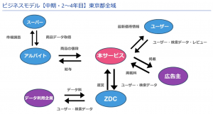 ビジネスモデルとしては、初期は世田谷区に絞り本サービスを提供予定。中期では、ユーザが増えることを想定し、サービスエリアの拡大や広告主、データ利用企業から掲載料などを収益として得ることを検討。また長期では、主要都府県まで拡大しAPIの情報などを不動産へ販売しより収益を得るビジネスモデルを想定。